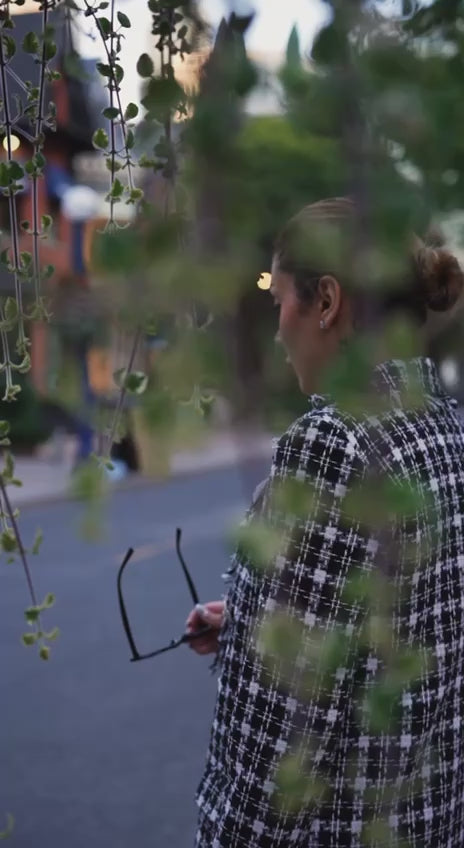 Introducing Cotton Tweed Shorts - the perfect street style shorts for your wardrobe! These shorts feature a black and white Houndstooth pattern, plus you can pair them with the same jacket for a complete look. Get ready to make a statement!