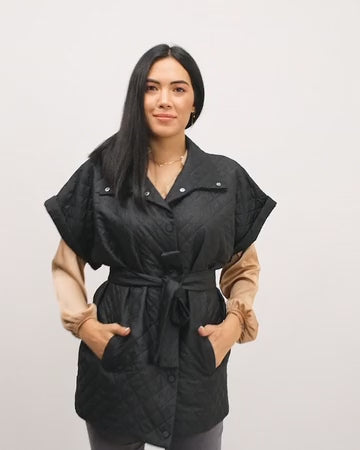 This fashionable black quilted jacket is a must-have for this spring. Keep warm while looking stylish with its quilted fabric, short sleeves and classic look. It's perfect for breezy days!
